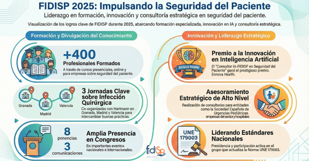 El año 2025 ha sido, para FIDISP, un ejercicio especialmente activo y significativo. A lo largo de estos doce meses, la Fundación ha desarrollado una amplia agenda de jornadas, formación, asesoría, investigación y proyectos estratégicos, reforzando su compromiso con la mejora de la seguridad del paciente y la calidad asistencial.